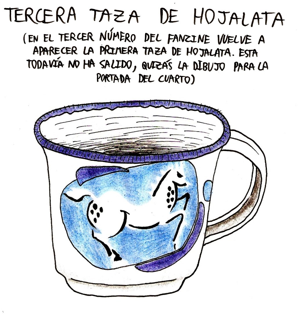 Este nuevo dibujo de la taza de hojalata original surgió de la necesidad de tener una imagen para el blog que no fuese un recorte cutre de la portada del primer número del fanzine. Inicialmente, iba a dejarlo en blanco y negro, pero esas flores son un elemento tan característico de esta taza que, por primera vez, me dio por colorearla. Espero no decepcionar a los puristas.
