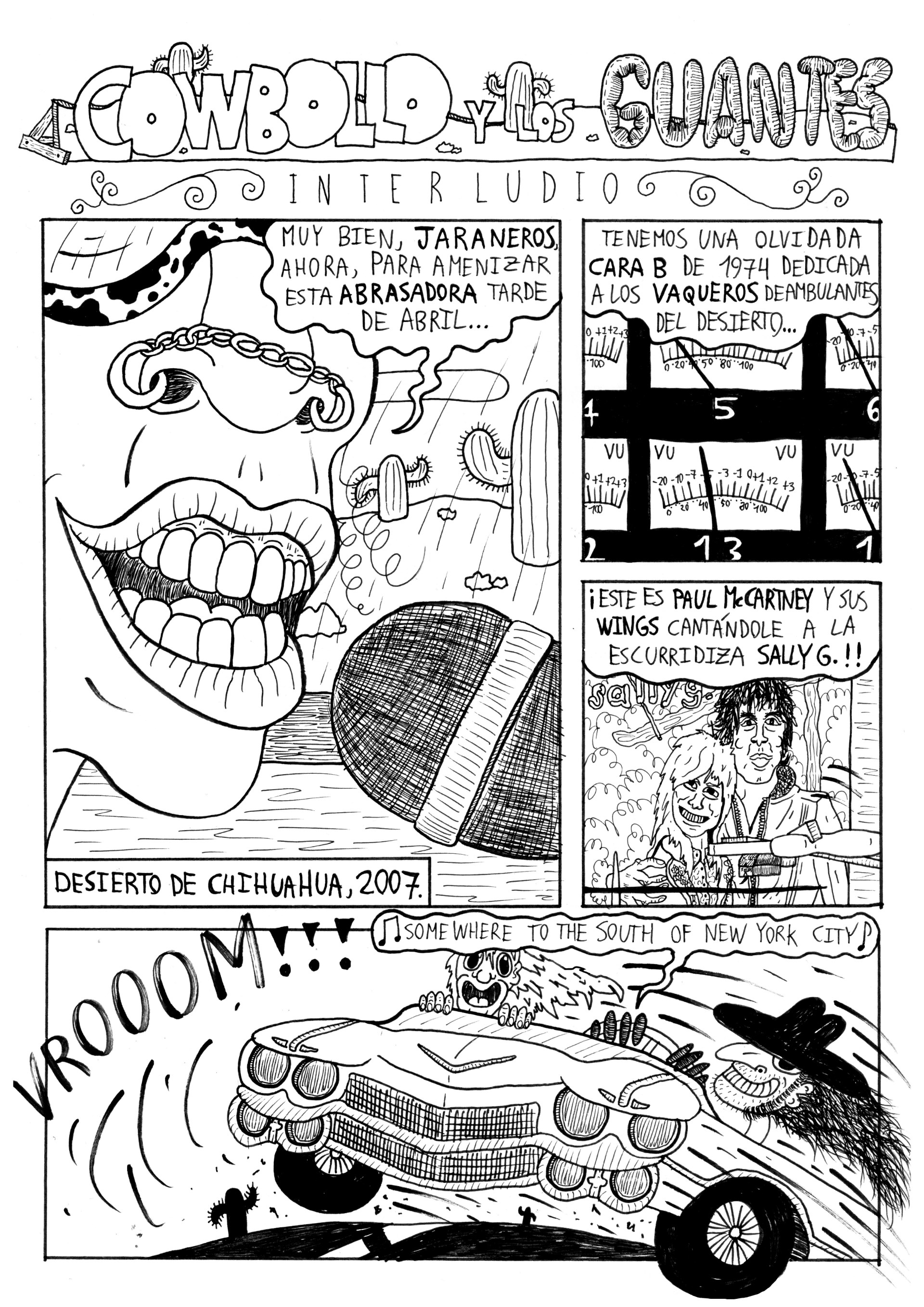 Tras de varias semanas de intensidad inclemente he podido encerrarme a dibujar las tres primeras páginas de la que será la continuación de la historieta ¡Cowbollo y los guantes!, que apareció en el TAZA DE HOJALATA #3. Cuando me embarqué en esa historia, tenía claras tres cosas: que quería un inicio impactante y salvaje, como la primera escena de Suspiria (Dario Argento, 1977); que trataría sobre doppelgängers y/o impostores y que profundizaría en el pasado familiar de la forajida que conocemos como Linda Santa María.