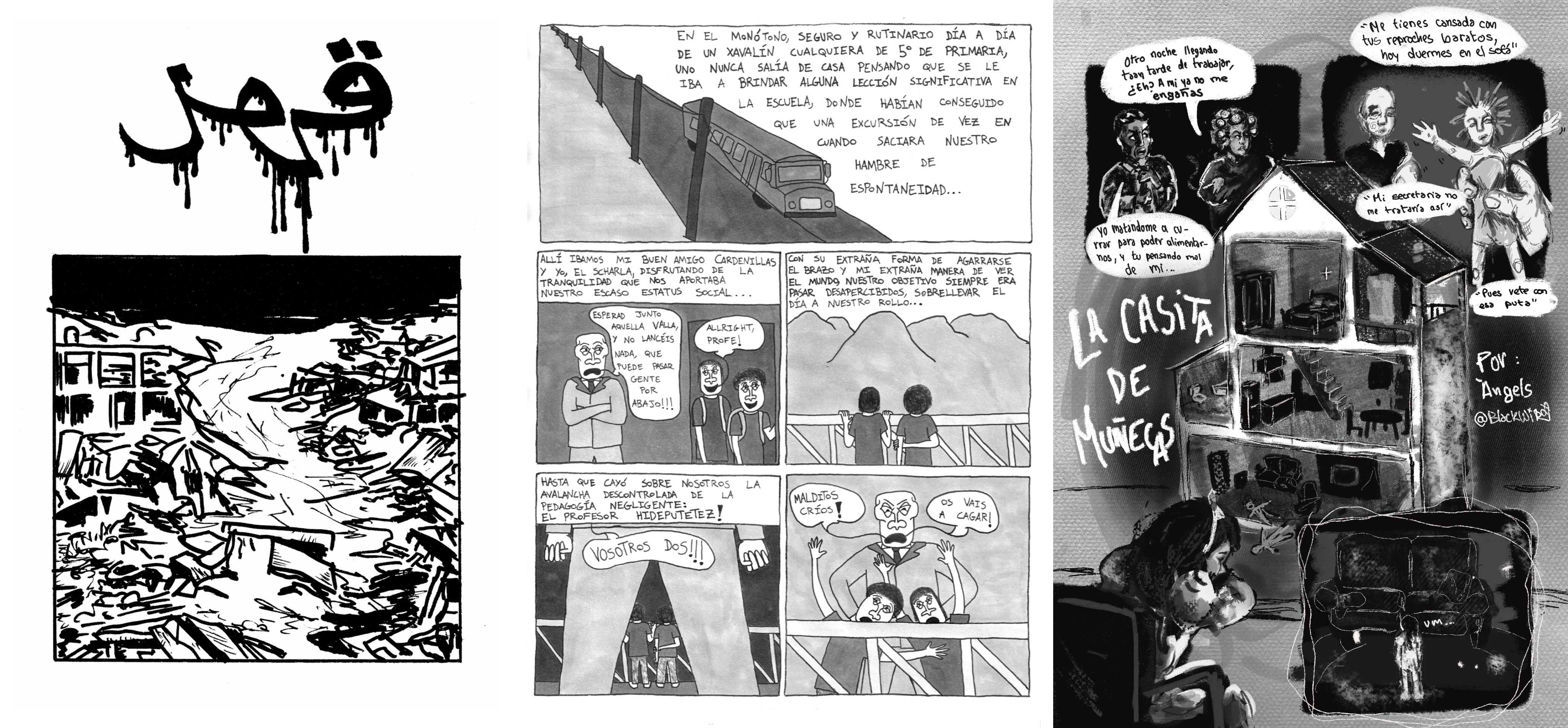 El primer tercio del fanzine lo encabeza Anti Z., que, paradójicamente, fue el último en enviarme el tebeo. Se trata de una breve pieza muda con la rabia por bandera, fruto de la injusticia, la opresión, el racismo y la deshumanización de estar presenciando en directo uno de los mayores genocidios de la historia. Sencillamente, no podía no empezar con él. Le siguen El Scharla, un dibujante incombustible que trabaja la viñeta única, pero que accedió a atreverse con una historieta más larga, y la joven valenciana Àngels Martínez, que se apuntó en el último momento, a solo diez días de la fecha de entrega. Creo que los tres son artistas a los que descubrí cuando me siguieron en Instagram, e inmediatamente entraron en mi radar de posibles participantes. Todos han cumplido con creces.