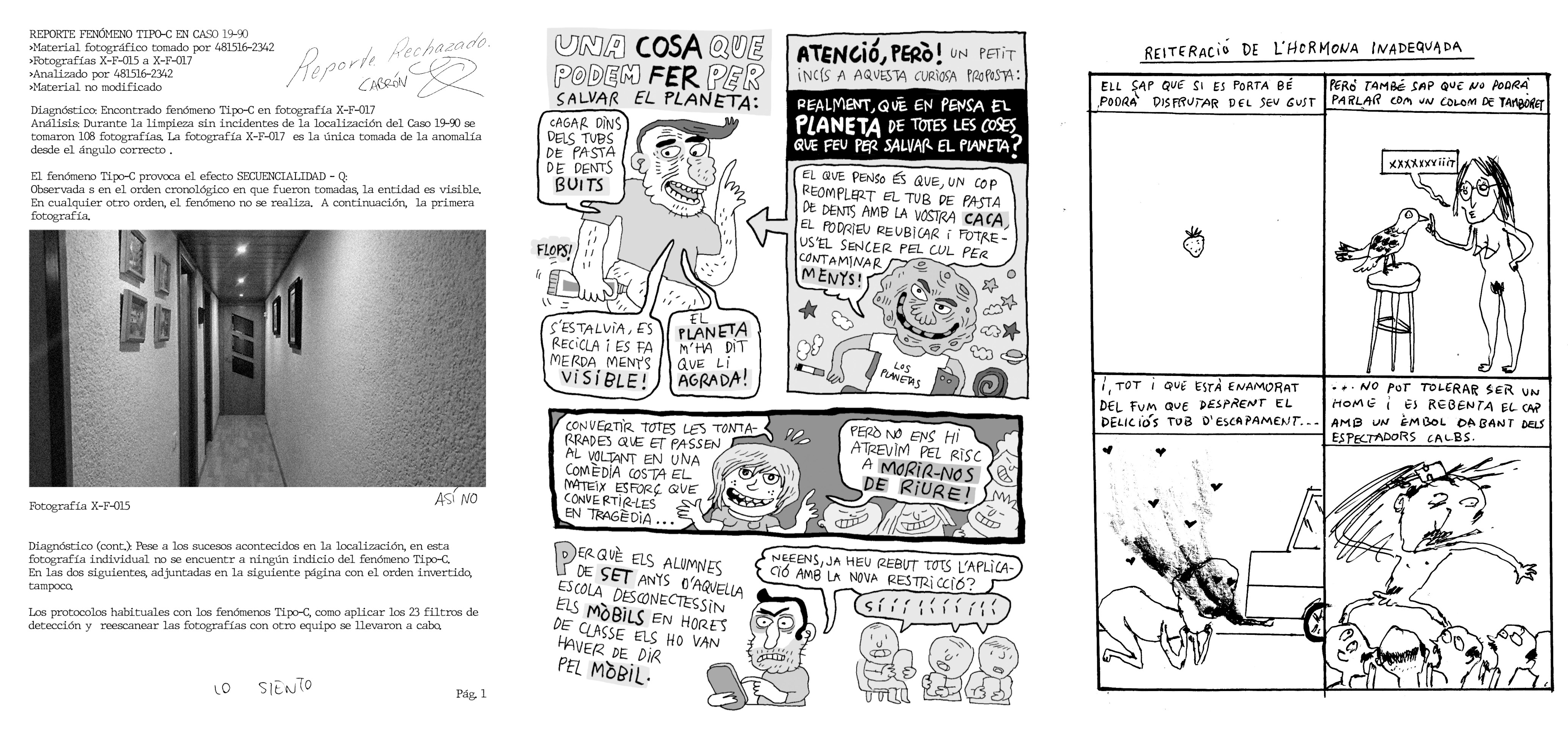 El fanzine sigue con una historieta de mi queridísimo amigo Iban Granero del Río, que sigue siendo, junto a mí mismo, la única persona que ha participado en todos los números de CENICERO. Lo que más me gusta de Iban es que ninguno de sus tebeos se parecen entre ellos: en el primero estaba claramente experimentando, pero el despliegue gráfico del segundo (una historieta de acción y terror protagonizada por una rata) o la adaptación de una de sus especialidades, el found footage, a imagen secuencial que ha hecho aquí me confirman que su presencia es imprescindible para asegurar la sorpresa en el fanzine. En este segundo tercio también encontramos una par de páginas de chistes gráficos del GRAN Roger Pelàez, mi tebeo y dos pequeñas historietas del dibujante, músico y pintor Oriol Roca, que subliman esa combinación gloriosa de abrasión y poesía que también está en sus canciones (UltraMega) y sus cuadros.